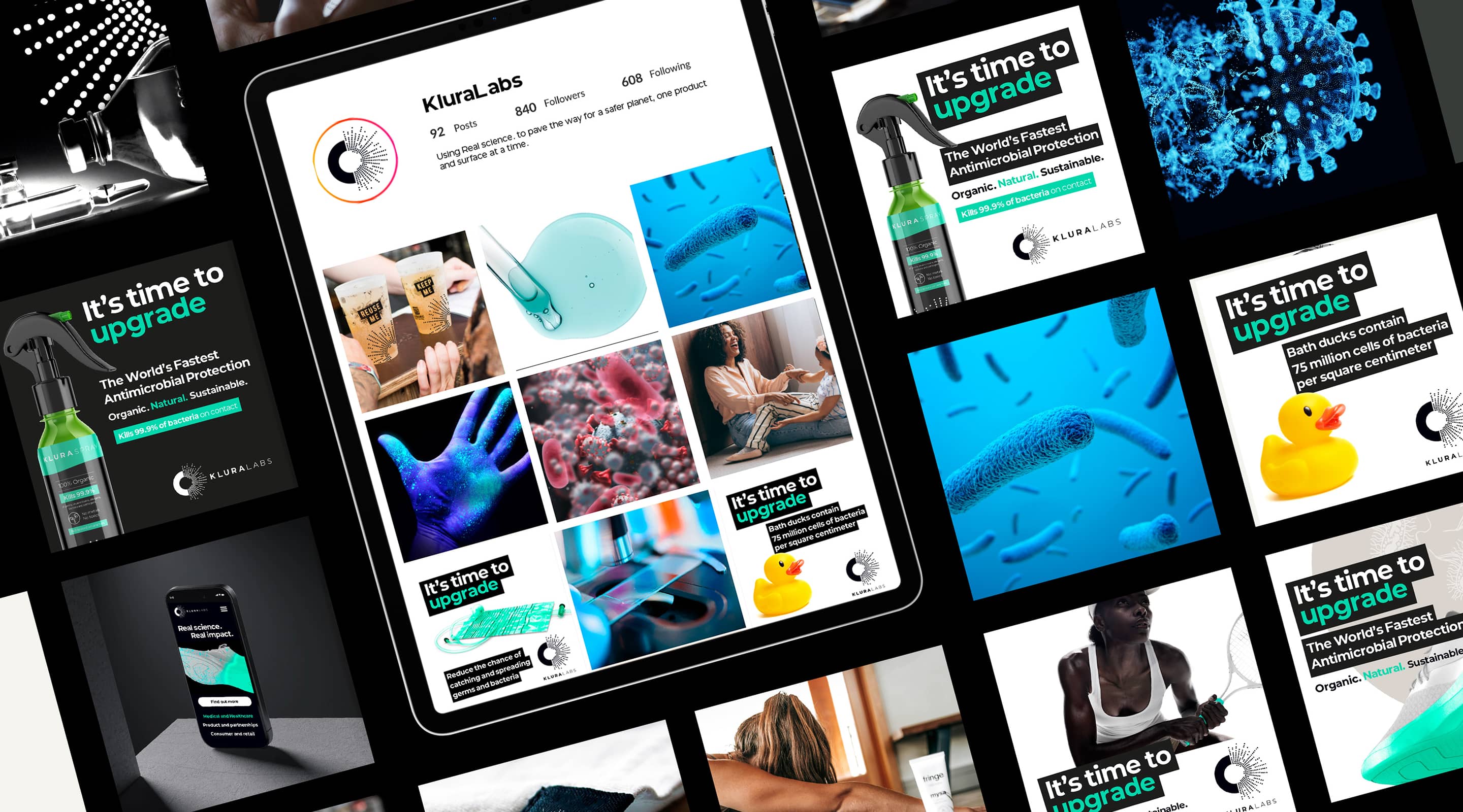 Next, imagery. KluraLabs™ didn’t have a huge budget for bespoke assets, but they did have a unique vision. “Where science becomes art” inspired their creative brief, and the HUB team was tasked with designing a stylised and distinct visual brand identity using only stock images.
